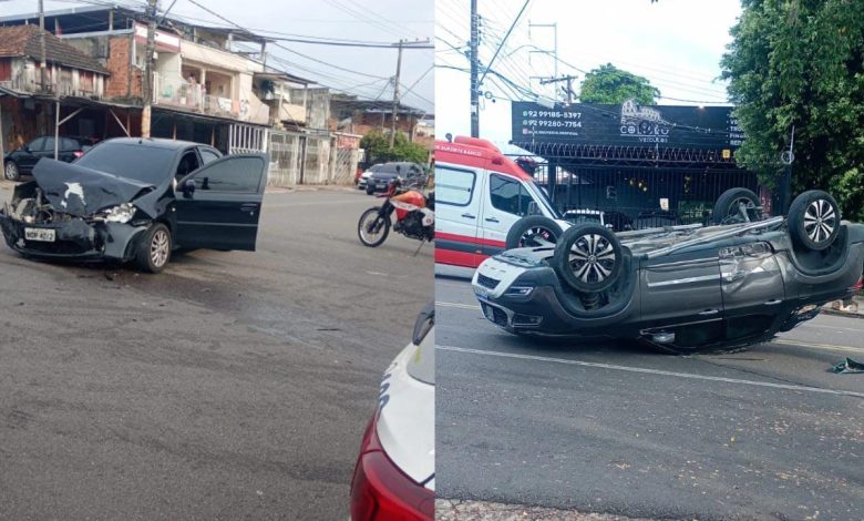 Acidente entre dois veículos provoca capotamento e complica o trânsito na zona Sul de Manaus