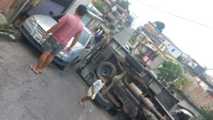 Na manhã desta terça-feira (25), um caminhão-baú tombou na rua Danilo Corrêa, no bairro Petrópolis, zona sul de Manaus, após perder o controle enquanto tentava subir uma ladeira. O acidente ocorreu quando o motorista precisou desviar de carros estacionados na beira da via, o que reduziu ainda mais o espaço disponível para a passagem do veículo.