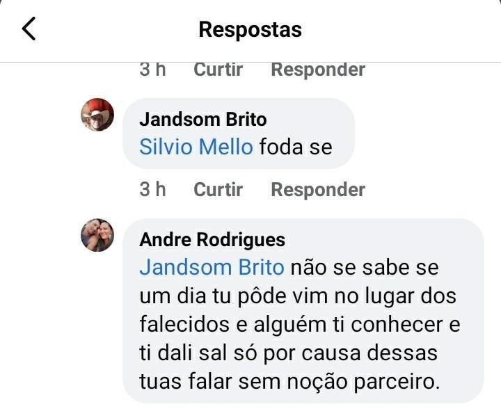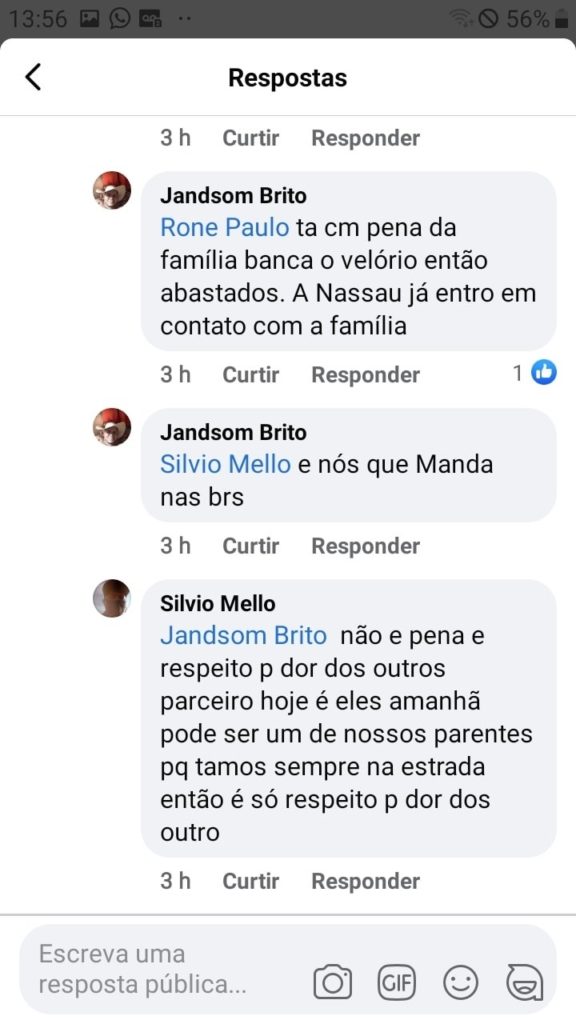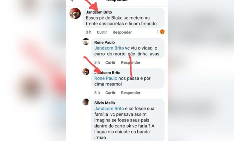Um perfil no Facebook, com o nome Jandsom Brito, fez comentários bárbaros sobre acidente. Nos comentários de uma postagem, ele diz: “ta cm pena da família banca o velório então abastados (SIC)”, “e nós que manda nas brs”, “Esses pé de Blake se metem na frente das carretas e ficam freando” e “nos passa e por cima mesmo”. Os prints das conversas estão circulando nas redes sociais.