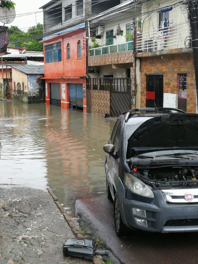 Moradores da área contaram que quando chove forte acontece esse problema, pois existe uma tubulação de esgoto que passa por baixo de um prédio e que está entupida e não dá vazão ao volume de água que desce pela rua. Outro problema relatado pelos moradores é a falta de assoreamento de um igarapé que passa próximo a essa área e que sobe de nível causando também muitos transtornos para quem mora próximo.
