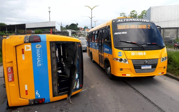 Um micro-ônibus amarelinho capotou durante um acidente ocorrido na tarde deste sábado (3), na Avenida Margarita, bairro Cidade Nova, zona Norte de Manaus.
