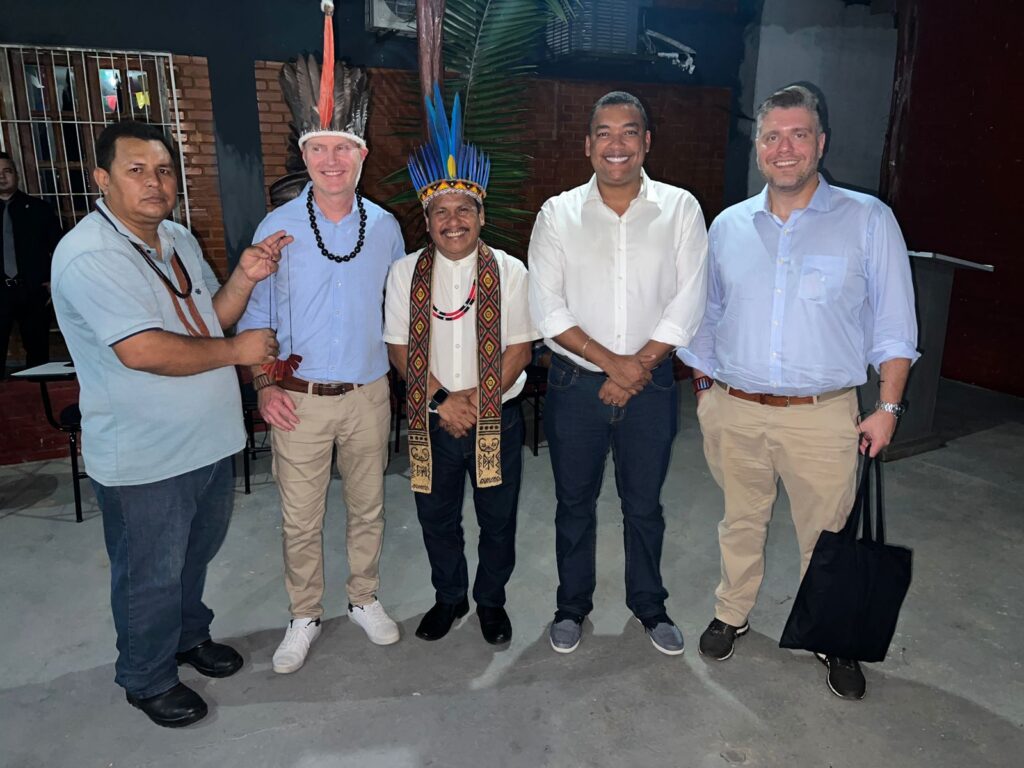 Estiveram recepcionando os membros da embaixada, o diretor-presidente da FEI, Sinésio Trovão; o diretor administrativo-financeiro, Vanderlei Alvino e o diretor-técnico, Luiz Braz que apresentaram as principais ações e serviços que a fundação vem executando no Estado com os povos originários e também projetos que pretendem colocar em prática como o da Vila Sustentável Sociocultural, a Copa Indígena Amazonense e a Fábrica de Chocolate Indígena que envolve a agricultura familiar.