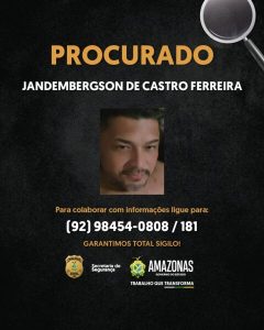 A Polícia Civil do Amazonas (PC-AM) está à procura de Jandembergson de Castro Ferreira, de 36 anos, suspeito de cometer os crimes de lesão corporal, perseguição, ameaça e descumprimento de medida protetiva contra sua ex-namorada, de 31 anos.