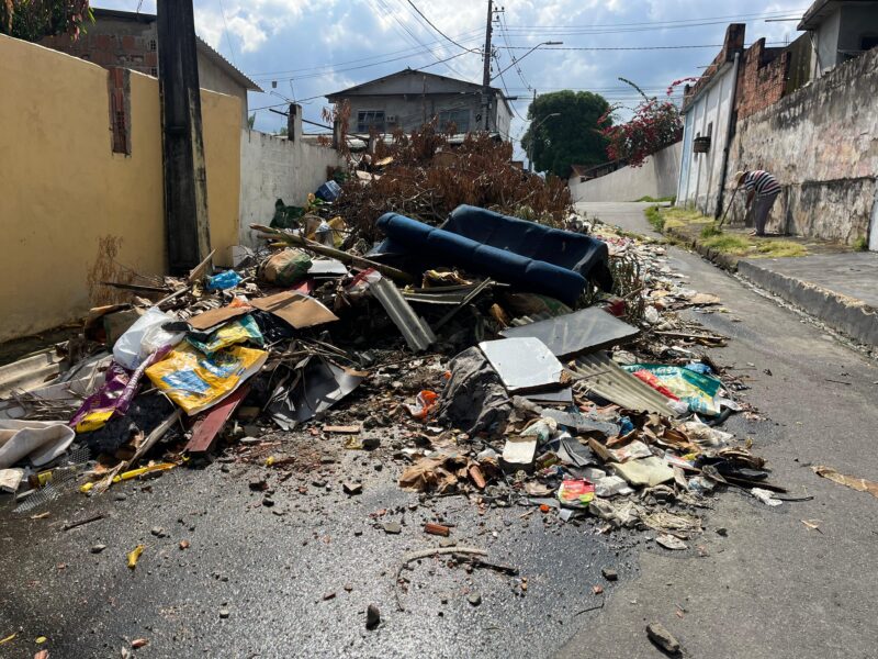 O acúmulo de lixo na Rua 15 de Novembro, no bairro Tancredo Neves, Zona Leste de Manaus, virou um pesadelo para os moradores da região. Há pelo menos três meses, a via está praticamente intransitável, tomada por montanhas de entulho que vão de restos de comida a sofás velhos, passando por embalagens de produtos automotivos e até calçados descartados.
