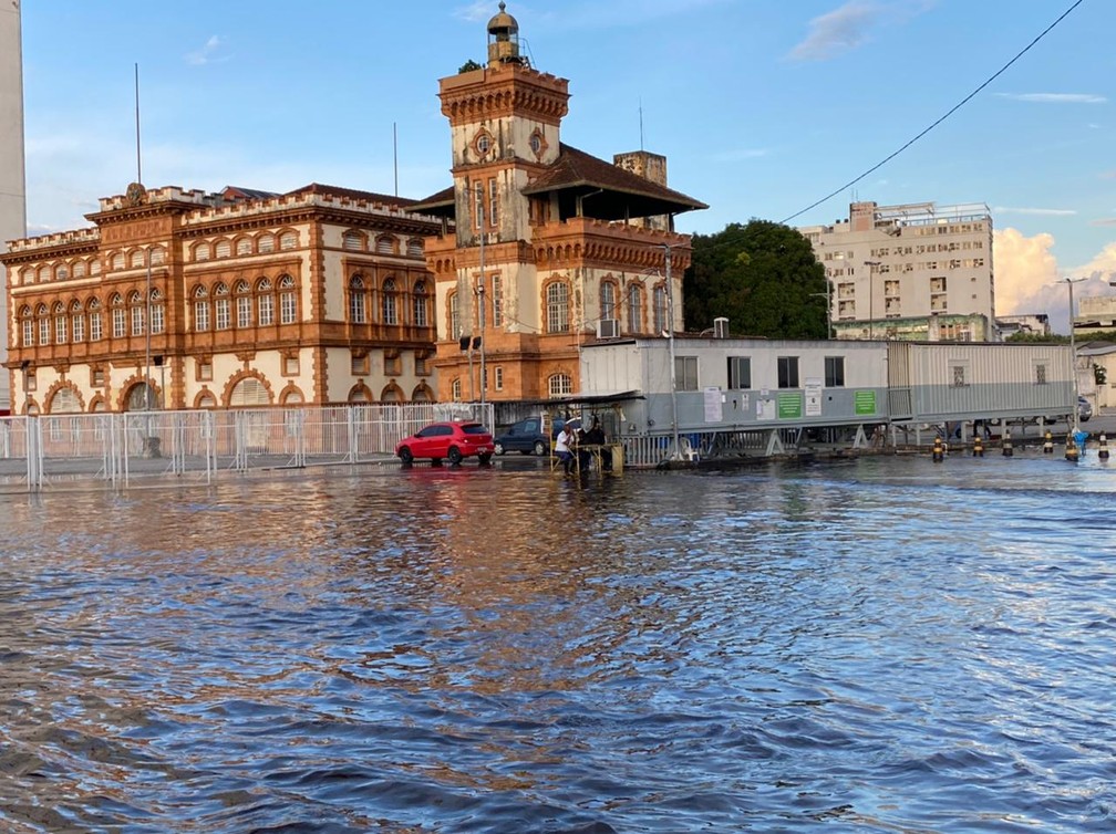 Em diversos pontos, a circulação de pessoas ocorre somente por meio de passarelas. O centro histórico registra vários pontos de alagamento. A Praça do Relógio e o prédio da Alfândega estão entre os locais mais atingidos.