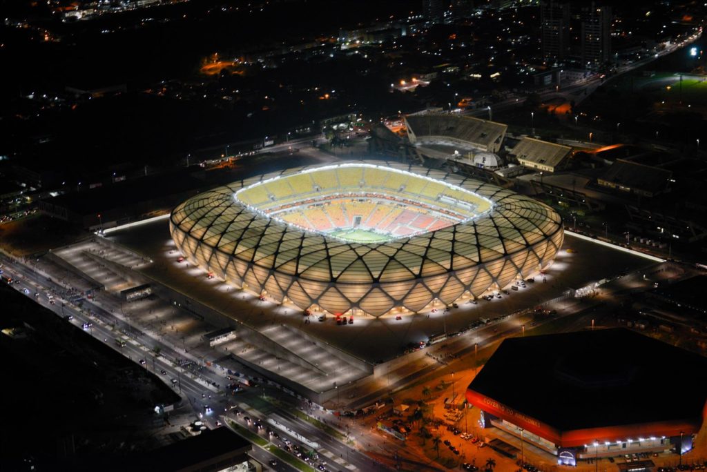 A Arena Amazônia foi inaugurada em 2014 para receber a Copa do Mundo no Brasil, e sua construção conta com estruturas metálicas em forma de aro, lembrando galhos de árvores, trançados como um cesto indígena.