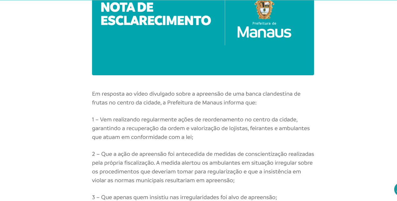 A Prefeitura de Manaus emitiu uma nota de esclarecimento sobre a abordagem de fiscais a vendedores ambulantes no centro da cidade, após a repercussão de um vídeo que mostrava a apreensão de uma banca clandestina de frutas. O episódio gerou indignação nas redes sociais devido à forma truculenta da ação.