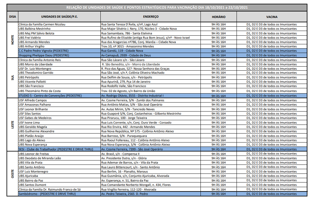 Manaus/AM – O Centro de Convenções Sambódromo e outros 38 postos espalhados pela cidade, retomam a partir das 9h desta segunda-feira (18), a vacinação contra a covid-19.