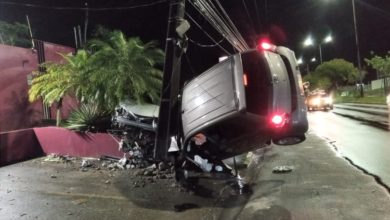 Carro fica pendurado em poste na saída de motel em Manaus