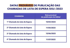 De acordo com o edital, a Universidade planeja concluir todo o processo de matrícula dos candidatos aprovados na Chamada Regular do Sisu até o dia 1º de abril. A partir de então, será feito o levantamento das vagas remanescentes para a elaboração do edital de matrícula dos candidatos aprovados na Primeira Chamada da Lista de Espera, cuja previsão de publicação é 10 de abril de 2023.