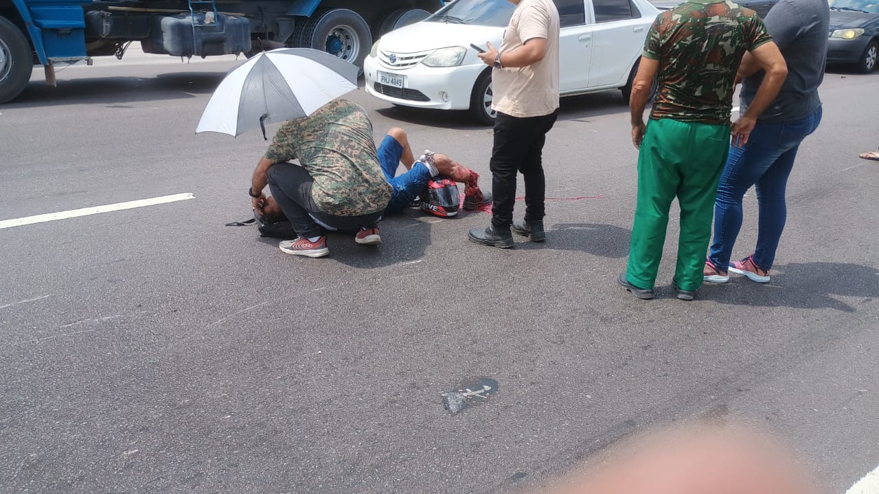 Um motociclista sofreu um grave acidente na Avenida das Torres, em Manaus, neste sábado (3), ficando com a perna dilacerada. O homem colidiu sua moto em um carro e parte da sua perna ficou gravemente ferida.